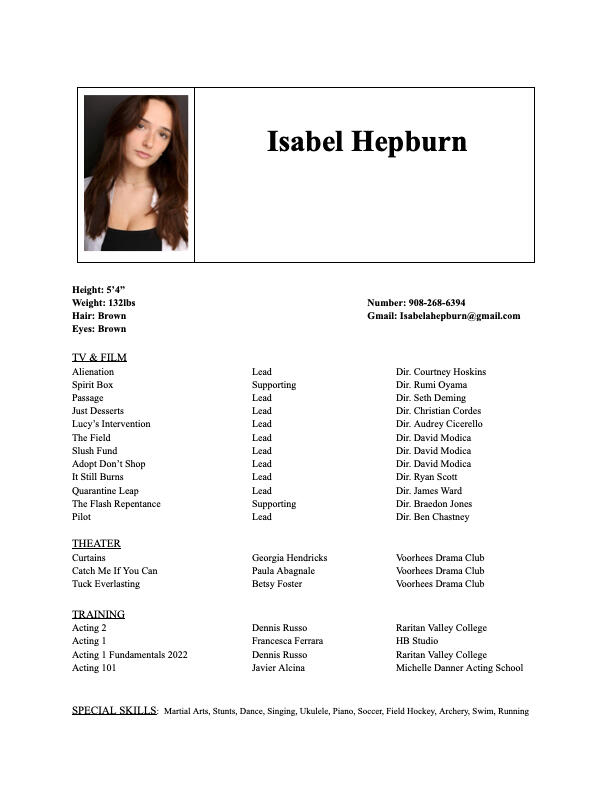 Isabel Hepburn is a versatile actress writer and director based in New Jersey, with a passion for storytelling that spans across film, television, and theater. Isabel’s acting journey began in high school, where she had a focus in musical theater before transitioning into film during her senior year. Since then, she has traveled across the country, gaining valuable experience and recognition along the way.Isabel has had the opportunity to take on lead roles in several award-winning and award-nominated projects, including TV shows, short films, and feature film proof of concepts. Her talent was recently recognized when she was nominated for Best Comedic Actress for her standout performance in Just Desserts.Not only is Isabel known for her acting, but she also recently made her directorial debut with the project Over On Athens Street, which she wrote, produced, acted in, and directed—a true testament to her creative versatility and ambition.Whether on stage or in front of the camera, Isabel’s work continues to captivate audiences, showcasing her dedication to her craft and her ability to bring complex, dynamic characters to life.Isabel is always looking to fuel her passion with new projects. Want to work together? Isabel would love to, connect below!